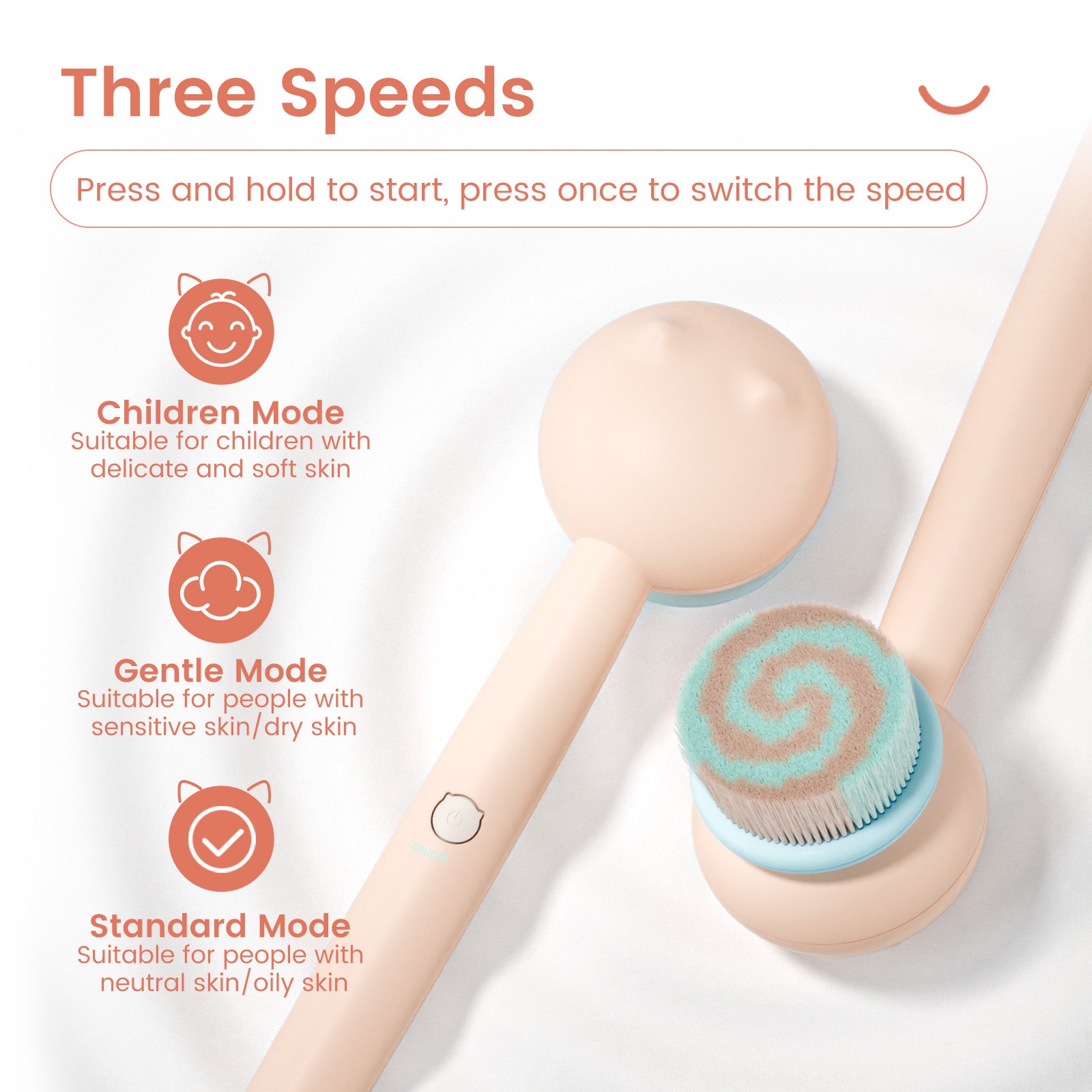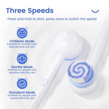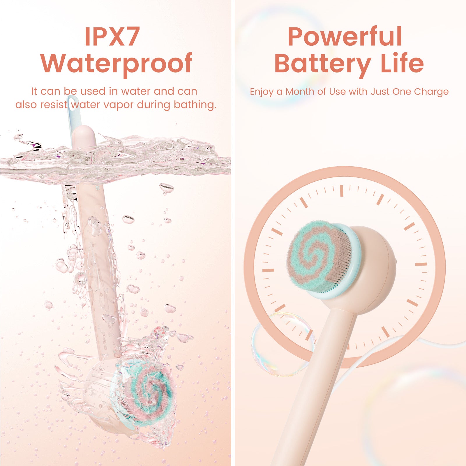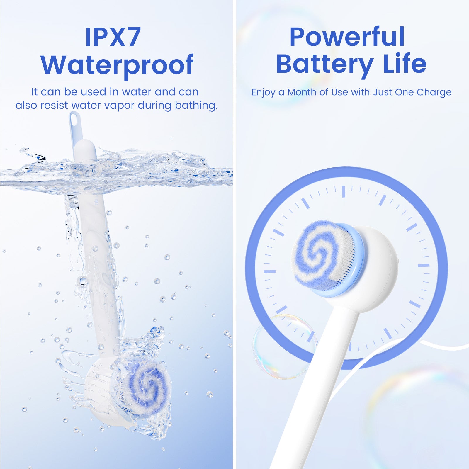 This electric body brush features IPX7 waterproof protection, making it safe for use in the shower. It includes two interchangeable brush heads and offers three adjustable speed modes (Gentle, Medium, and Strong), allowing you to customize your cleansing routine.